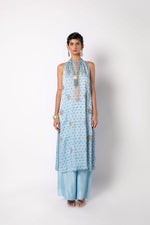 Block printed kurta with embroidered buttis and neckline. Straight block printed pants.