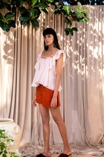Square neck with hand embroidered edging on this fun flared paneled blouse. The blouse has a tie-up detail on back and flange style sleeve cut. The set comes with comfortable cotton-twill shorts.