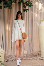 Chanderi A-line shift dress with fine pleat detail below empire line, Lo-hi hemline and long sleeves with slit. Self color embroidery on yoke and sleeves.